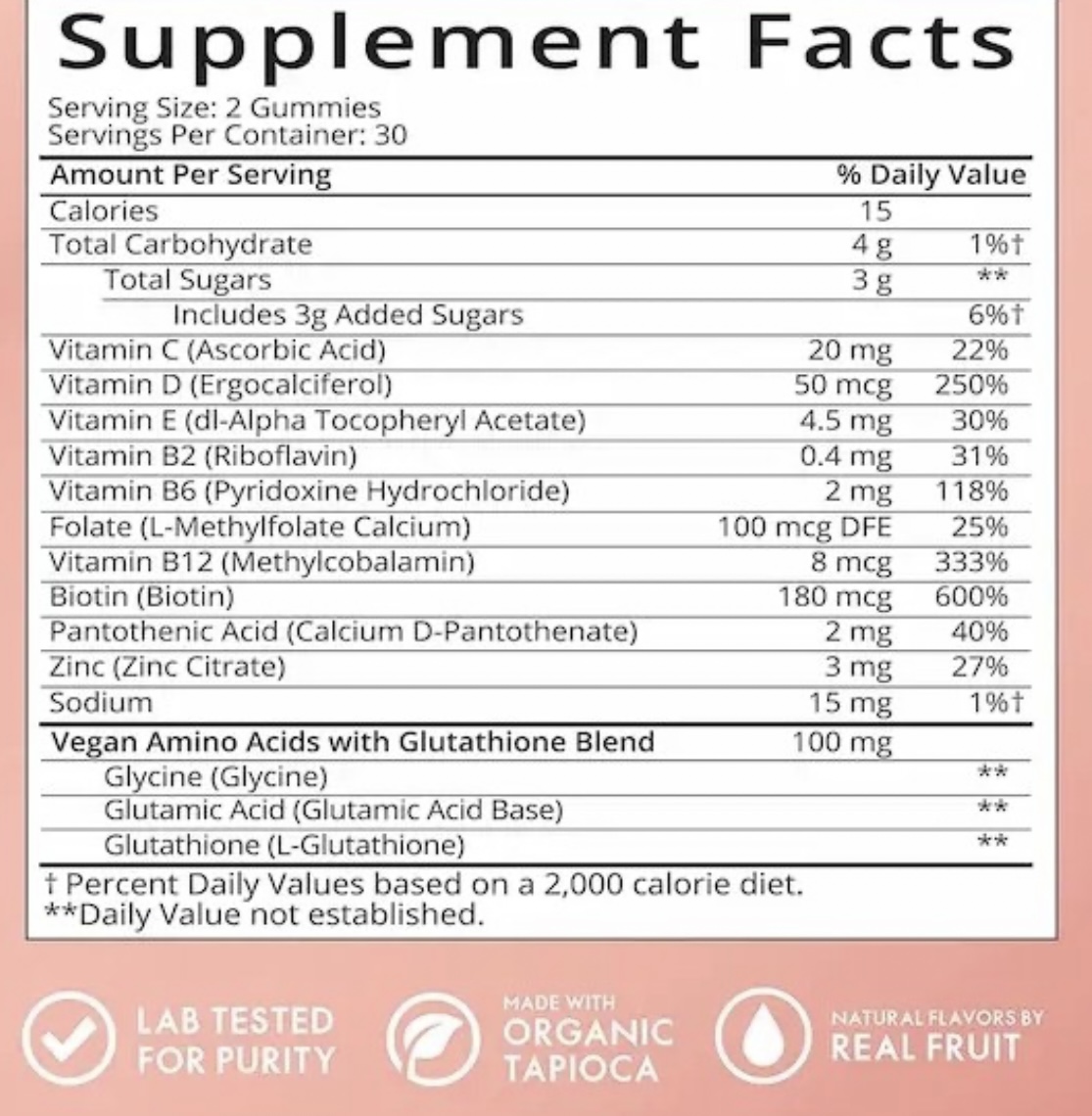 100 میلی گرم اسیدهای آمینه + پپتیدها: Sugarbear ProCollagen دارای 100 میلی گرم اسیدهای آمینه + پپتیدهای بدون حیوان است: گلیسین، اسید گلوتامیک و آنتی اکسیدان گلوتاتیون. این ترکیب اختصاصی در یک مرکز غذایی از منابع گیاهی ساخته شده است.